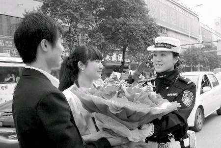 綿陽一對新人的婚車車隊在如潮的車流中難以前行,綿陽交警直屬一大隊女子警組民警吳莎了解情況后,開著交警流動服務車引道,順利將車隊帶到酒店。昨日上午,新郎新娘抱著鮮花,幾經周折找到“護嫁天使”吳莎,表示感謝。綿陽和成都市民紛紛撥打本報綿陽新聞熱線表示,交警吳莎為普通老百姓的婚車引道,既疏導了交通,又體現了交警的人性化執法。