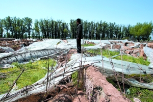 昨日8時,位于昌平區(qū)沙河鎮(zhèn)踩河新村的一蔬菜基地,兩百米長的圍墻已變成殘?jiān)珨啾冢瑤讉菜大棚被夷為平地,旁邊竹竿和塑料交錯,油菜被壓扁,菜地上有車輪痕跡。菜農(nóng)介紹,昨日凌晨4時許,14輛鏟車推開圍墻,推倒30畝左右的蔬菜大棚。