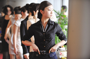 候場區,美女云集的地方,只要一個轉身,你就可以看見近千名佳麗有的在偷偷補妝,有的對著鏡子練習微笑。在等候面試的美女中,有帶著綠色美瞳的美國加州留學生,有穿背帶褲剛剛高中畢業的學生,還有身著職業裝想換個工作的公司白領!艾F在工作不好找,所以只要有招聘就來試試咯。”這是記者在現場聽到最多的一句話。