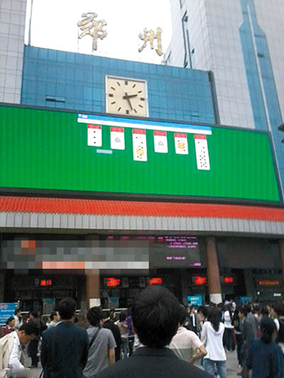 5月16日,鄭州火車站本該顯示車站公告的戶外超大顯示屏上,卻出現了紙牌游戲(見圖),共耗時20來分鐘,游戲過關后,綠色屏幕上煙花襯著“你贏了”三字。鄭州火車站表示當時打牌的人不是火車站的工作人員,是施工方的。據瀟湘晨報報道,昨晚,河南本地一公司宣稱對此事負責并致歉。
