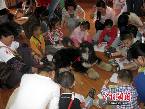 狗狗們不僅表演了才藝,還當(dāng)起了狗模特。小朋友們用手中的畫筆描繪出心中狗醫(yī)生的模樣。看著孩子們興奮的樣子,四川聾兒康復(fù)中心的老師十分感慨:“這些孩子因?yàn)槁犃τ幸恍┱系K,平日顯得很內(nèi)向和自閉。而這些狗狗出現(xiàn)時(shí),孩子的天性立刻顯現(xiàn)了出來(lái),他們用含糊不清的聲音叫狗狗的名字,看著老師的口型努力去發(fā)出那些音節(jié),表現(xiàn)出了對(duì)狗狗的極大熱情。我們非常喜愛并期待狗醫(yī)生的到來(lái)。”