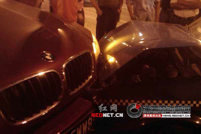 5月31日晚9時左右,長沙市韶山南路砂子塘路段發生一起車禍,一輛寶馬越野車在拐彎時走錯車道,逆行與一輛等紅燈的的士相撞后,推著的士前進了近20米,導致包括的士車在內的5車連環追尾。