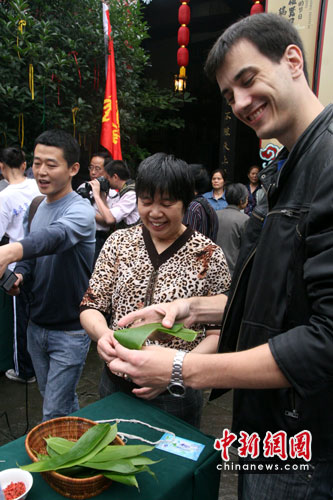 中新網重慶6月12日電 (孟幻)端午將至,包粽子、掛菖蒲……中國傳統習俗不能少。12日,匈牙利、柬埔寨等駐渝領事官員與20余個國家的留學生在重慶千年古鎮磁器口親手包粽子,與中國傳統習俗來了一次零距離接觸。
