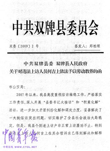 33歲的何守業至今不敢回家。其父何吉上因舉報村支書侵占退耕還林款未見“效果”,多次上告,被認定“沖擊國家機關”。在檢察機關認定其不構成犯罪之后,湖南省永州市雙牌縣委書記鄭柏順簽發“勞教”文件。2009年8月,永州市“勞教委”決定對何吉上勞動教養一年。