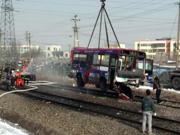 實拍:烏魯木齊列車公交相撞現場 公交被吊走
