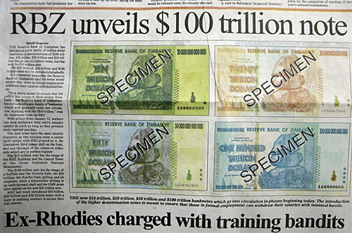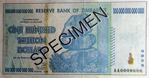 1月16日 津巴布韋儲(chǔ)備銀行發(fā)行了一套世界上最大面額的鈔票,這套面額在萬億以上的鈔票包括10萬億(約200多元人民幣),20萬億,50萬億和100萬億共四種。