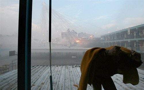 以軍1月17日再次襲擊加沙北部一所聯合國學校,一名婦女和一名兒童喪生,以軍坦克和巴勒斯坦武裝分子在學校附近激烈交火。圖為一名巴勒斯坦人在戰火中逃生。