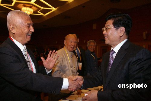 1月10日,中國僑聯七屆五次全委會議在北京舉行,中共中央政治局委員、全國人大常委會副委員長王兆國出席會議并作重要講話。圖為王兆國(右一)與全國僑聯顧問莊炎林(左一)握手交談。中新社發 張勤 攝