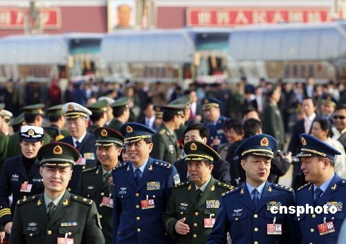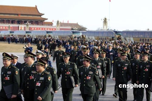 3月9日,十一屆全國人大二次會議在北京人民大會堂舉行第二次全體會議,解放軍代表團(tuán)步入會場。中新社發(fā) 盛佳鵬 攝