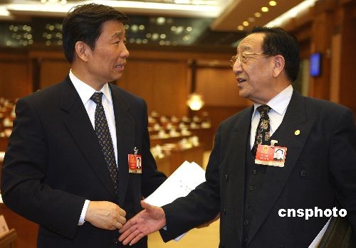 3月12日上午,十一屆全國人大二次會議第三次主席團(tuán)會議在北京人民大會堂舉行。會議經(jīng)過表決,決定將關(guān)于全國人大常委會工作報告的決議草案、關(guān)于最高人民法院工作報告的決議草案、關(guān)于最高人民檢察院工作報告的決議草案提請各代表團(tuán)審議。主席團(tuán)成員李源潮(左)、列確(西藏自治區(qū)人大常委會主任)出席。中新社發(fā) 任晨鳴 攝