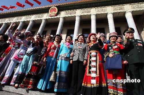 3月13日,第十一屆全國(guó)人民代表大會(huì)第二次會(huì)議在人民大會(huì)堂閉幕,代表們?cè)谌嗣翊髸?huì)堂前留影。中新社發(fā) 杜洋 攝