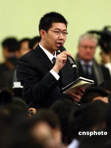 3月13日上午,溫家寶總理舉行中外記者招待會。中國新聞社記者、中國新聞網記者翁陽在發布會上向溫家寶總理提問。中新社發 杜洋 攝
