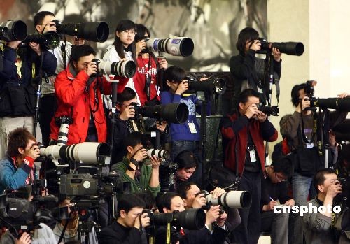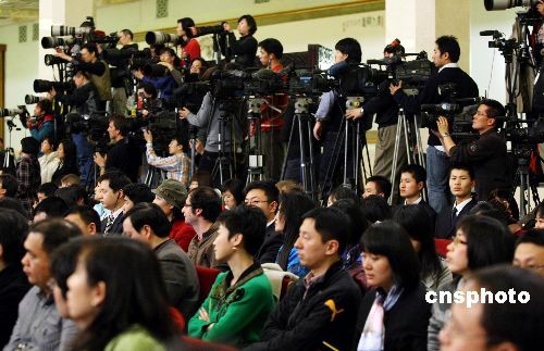 3月13日上午10時,國務院總理溫家寶應十一屆全國人大二次會議大會發言人的邀請,在人民大會堂與采訪大會的中外記者見面并回答記者提出的問題。眾多攝影記者“長槍短炮”關注總理發布會。