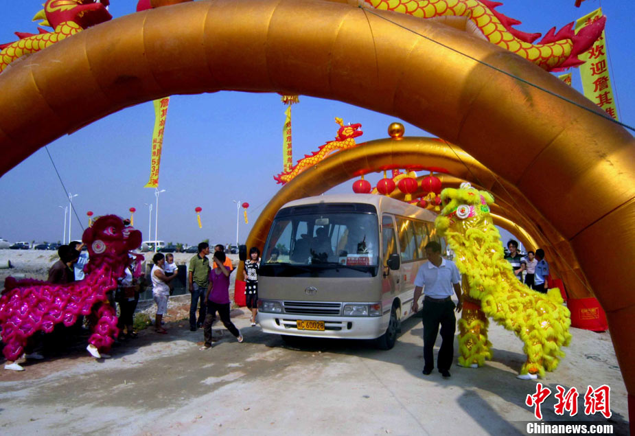 9月27日,被日方非法抓扣的中國漁船船長詹其雄返回家鄉--福建晉江市深滬鎮港滬村。當地鄉親熱情迎接他歸來。圖為詹其雄(圖中)下車后笑容滿面,受到了當地民眾的熱烈歡迎。中新社發 孫虹 攝