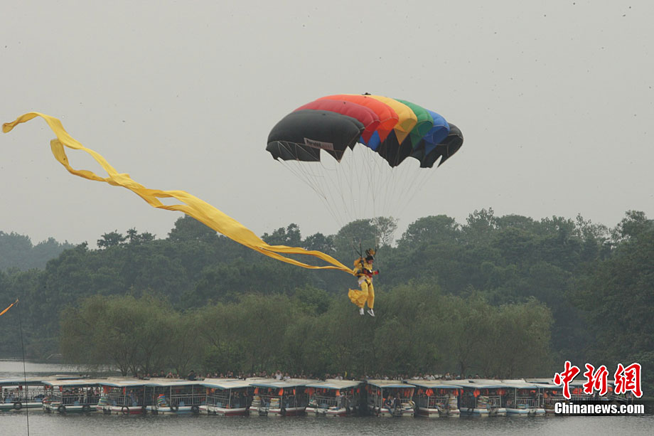 中新網大足10月4日電 (連肖 杜遠)4日下午,重慶大足首屆國際航空體育旅游節開幕,空軍“八一”跳傘隊和英國兩支特技飛行隊在大足龍水湖上空上演了多項空中特技。其中,兩名英國女郎站在時速高達240公里的飛機機翼上表演各種芭蕾動作,引得觀眾大呼驚險。連肖 攝
