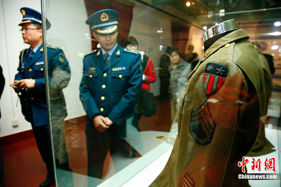 11月9日,由知名僑領陳燦培向昆明市捐贈的1100件飛虎隊文物在云南陸軍講武堂展出。創立于上個世紀40年代的飛虎隊,又稱中國空軍美國志愿援華航空隊。在抗日戰爭中對日作戰,運送物資,戰果累累。圖為參觀展覽的空軍官兵。中新社記者 劉冉陽 攝