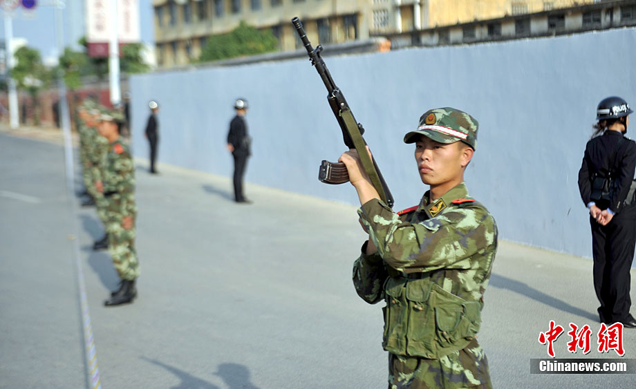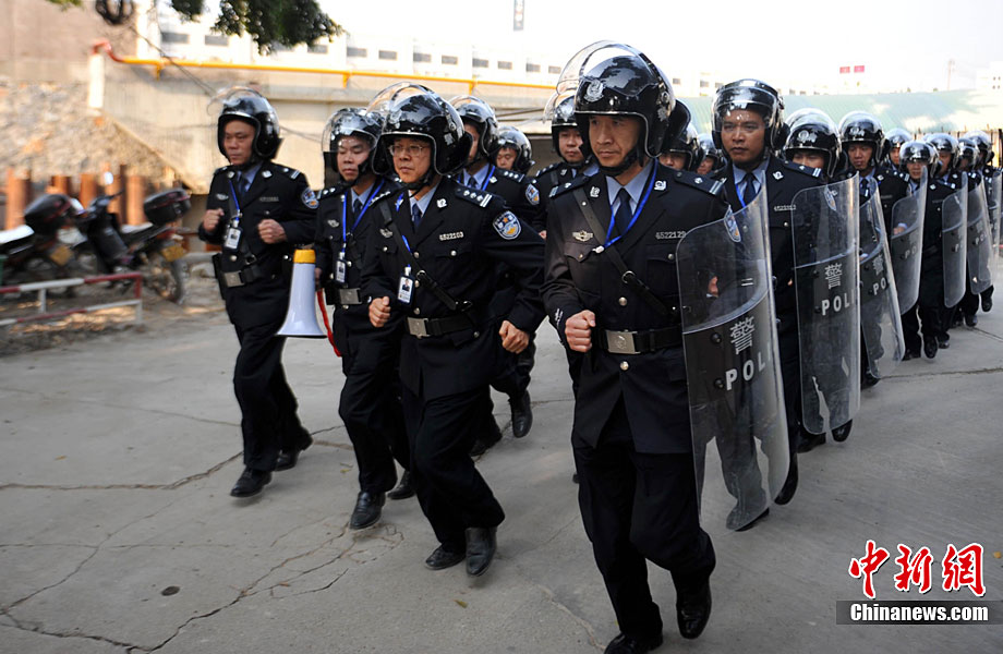 11月11日下午,為提高監(jiān)獄安全防范和及時有效處置突發(fā)事件的能力,廣西監(jiān)獄局組織駐南寧監(jiān)獄單位進(jìn)行了制暴追逃預(yù)案應(yīng)急處置實(shí)戰(zhàn)演練。本次制暴追逃演練是駐南寧市監(jiān)獄單位和武警、公安交警應(yīng)對突發(fā)事件的首次聯(lián)合大練兵。參與警力達(dá)260余人。“事發(fā)監(jiān)獄”在周邊監(jiān)獄單位、武警官兵、公安民警的權(quán)利配合下,成功處置4名“罪犯”企圖制造騷亂、趁機(jī)越獄脫逃“事件”。中新社記者 蔣雪林 攝