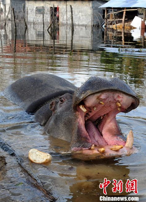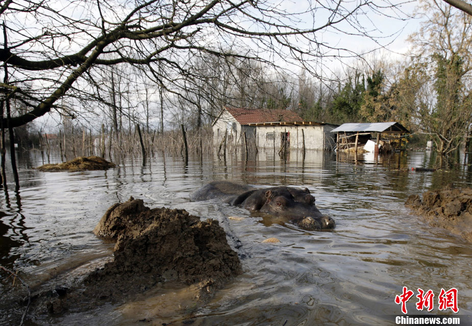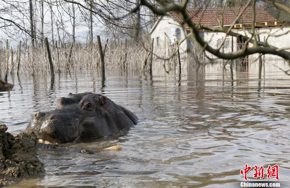 巴爾干半島西部連日來頻遭大雨侵襲,造成波斯尼亞和黑塞哥維那、塞爾維亞、黑山和阿爾巴尼亞的許多地區洪水泛濫,數千人被迫撤離家園。圖為6日,在黑山的普拉夫尼察,一頭從動物園中逃出的河馬在洪水中游泳。