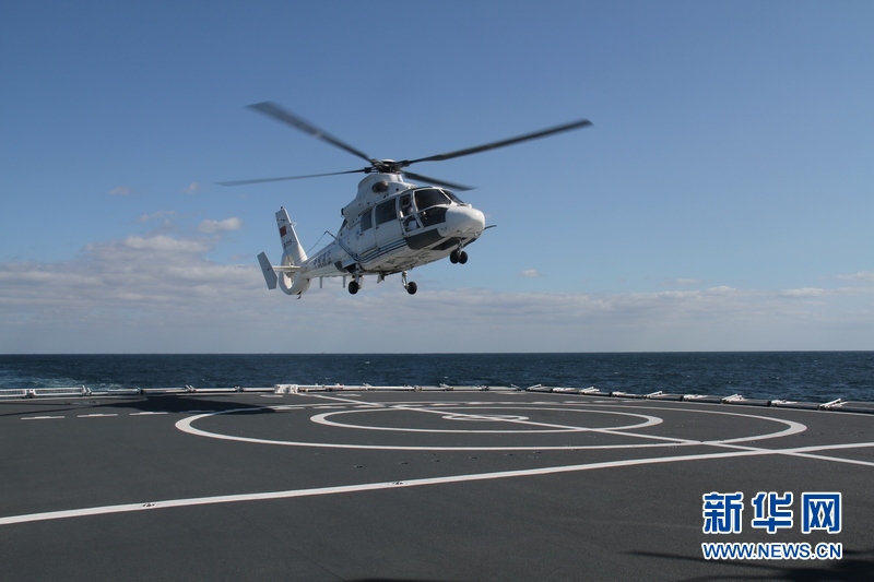 運(yùn)送“傷員”海監(jiān)直升機(jī)降落在“和平方舟”醫(yī)院船。王經(jīng)國(guó) 攝 圖片來(lái)源:新華網(wǎng)