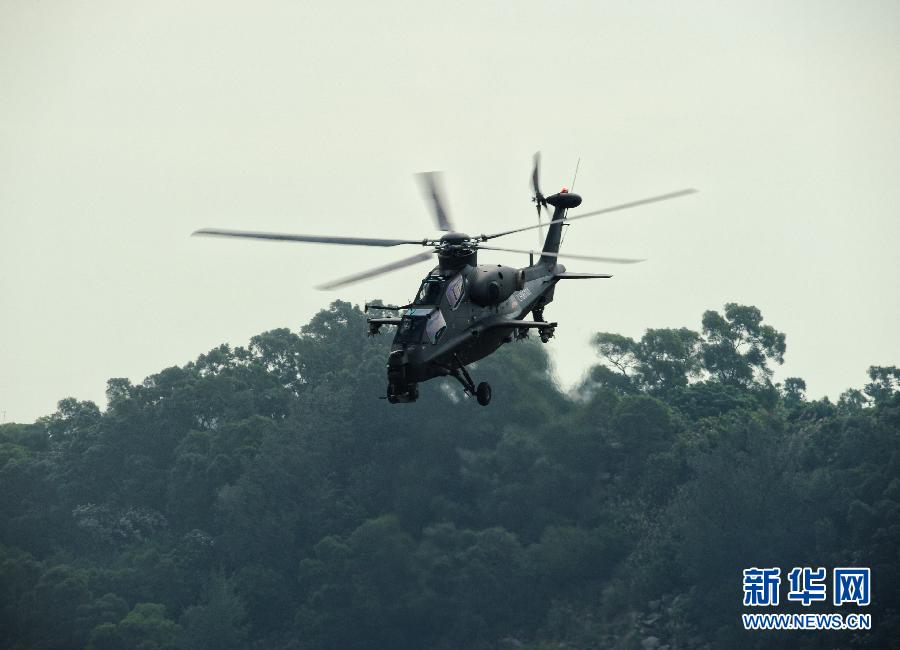 2012年11月11日,國產(chǎn)武直10武裝直升機(jī)在珠海三灶機(jī)場進(jìn)行飛行訓(xùn)練。當(dāng)日,我國自主研制生產(chǎn)的武直10武裝直升機(jī)在珠海三灶機(jī)場進(jìn)行了約20分鐘的適應(yīng)性飛行訓(xùn)練,做出倒飛、萊維斯曼機(jī)動(dòng)、高速大角度俯沖、低空小半徑盤旋等動(dòng)作,展現(xiàn)出其優(yōu)異性能,引來航展現(xiàn)場觀眾頻頻喝彩。楊光 攝 圖片來源:新華網(wǎng)