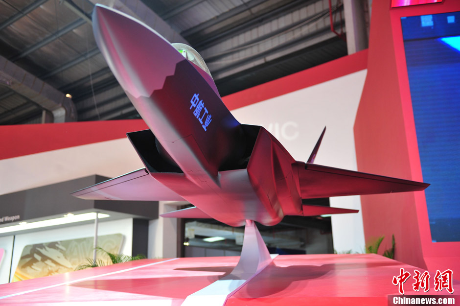 11月13日上午,第九屆中國國際航空航天博覽會在廣東珠海開幕,一架中國先進戰斗機概念模型在中航工業展臺亮相,從外形上看,與前不久成功試飛的殲31相似,備受關注。中新社發 柯小軍 攝
