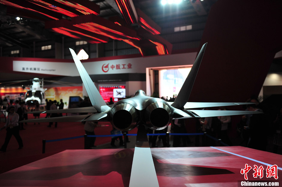 11月13日上午,第九屆中國(guó)國(guó)際航空航天博覽會(huì)在廣東珠海開(kāi)幕,一架中國(guó)先進(jìn)戰(zhàn)斗機(jī)概念模型在中航工業(yè)展臺(tái)亮相,從外形上看,與前不久成功試飛的殲31相似,備受關(guān)注。中新社發(fā) 柯小軍 攝