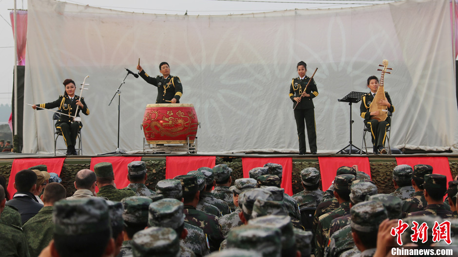 8月10日,隨同中方參演部隊(duì)赴俄羅斯參加“和平使命-2013”中俄聯(lián)演的沈陽(yáng)軍區(qū)政治部文工團(tuán)演員們,為中俄千余名參演官兵獻(xiàn)上了一場(chǎng)精彩的文藝晚會(huì)。豐富多彩的文藝節(jié)目,將位于切巴爾庫(kù)爾訓(xùn)練場(chǎng)的中俄聯(lián)演野營(yíng)村,變成了友誼的盛會(huì)、歡樂的海洋。圖為民樂合奏《出征》。中新社發(fā) 李祥輝 攝