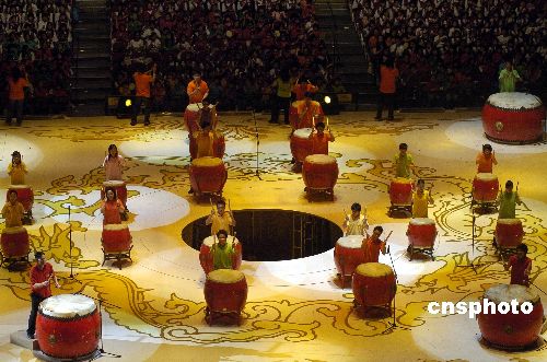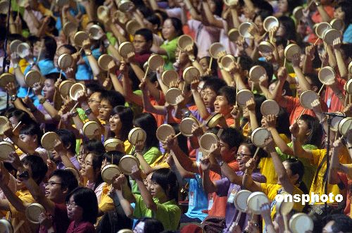 | 2007年6月29日,為慶祝香港回歸祖國10周年,萬名來自內地、香港、澳門、臺灣的青年齊集香港體育館,以“鼓樂飛揚”的創意、勵志激昂的樂曲為藍本、擊打萬面鼓的形式,創出新的吉尼斯世界紀錄。本次活動主題為《龍聲鼓舞--萬人青年音樂會》,由香港民政事務局、中華全國青年聯合會、香港青年協會及中央電視臺等有關機構聯合舉辦。萬人鼓樂《龍的傳人》和《紅日》曲目由著名打擊樂家龍向榮博士編曲及領奏,以五種鼓樂合奏,包括鈴鼓、布郎鼓、雙棍單皮鼓、沙槌鼓和皮手鼓,在超過一萬名青年齊心合奏下完成。中新社發 吳峻 攝