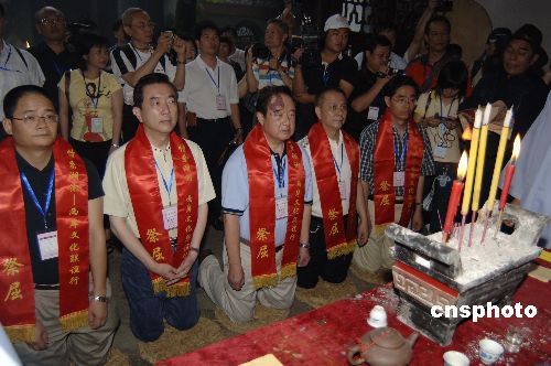 | 7月11日,參加由中華文化聯誼會主辦的“情系湖湘——兩岸文化聯誼行”的二百余位臺灣、香港、澳門文化界人士共同來到湖南省汨羅市,參訪屈子祠,祭拜偉大詩人屈原。澳門基金會行政委員吳志良、臺灣中國文化大學法研所教授、海基會前秘書長焦仁和、華視文教基金會董事長周蓉生、香港中華文化總會副監事長楊升建、文化部港澳臺司司長助理、中華文化聯誼會會長助理汪志剛(從左至右)等代表行祭拜禮。中新社發 徐曦弋 攝