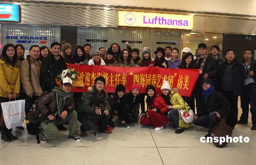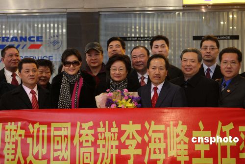 1月28日,中國國務院僑辦主任李海峰率領“文化中國·四海同春”藝術團一行40人抵達紐約,開始在美國為期19天的藝術之旅,與美國華人華僑同慶新春。著名歌唱家宋祖英、閻維文等隨團抵達。中國駐紐約總領事彭克玉、美東華人社團聯合總會共同主席梁冠軍和陳清泉、秘書長林學文,美國福建同鄉會代主席鄭棋,美國福建公所代主席鄭時甘,美國上海聯誼會會長承立平,崇正會主席朱天長等紐約當地僑領及各客屬僑團負責人等,均到機場迎接李海峰一行。中新社發 魏晞 攝