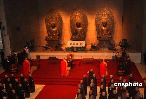 2月15日,臺灣法鼓山創辦人圣嚴法師追思法會暨植存在法鼓山舉行。圖為圣嚴法師生前摯友今能、寬裕及廣慈三位主法長老在世界佛教教育園區大殿唱誦心經,送圣嚴法師最后一程。中新社發 陳立宇 攝