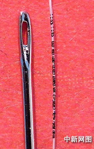 為歡迎大熊貓團團圓圓到臺灣定居,臺灣著名微雕家陳逢顯在一根自己斑白的頭發上雕刻了兩只大熊貓并在下面寫上“團團與圓圓在臺灣陳逢顯”十一個字。左側為小縫衣針,右側為0.5厘米長的白頭發。 中新社記者 陳立宇 攝