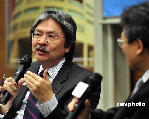 三月三日,香港特區財政司司長曾俊華,在浸會大學與學生舉行座談會,討論財政預算案。中新社發 譚達明 攝