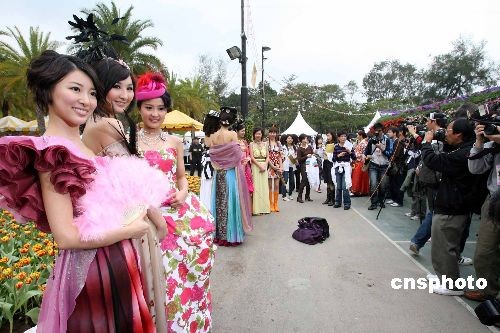 三月十二日,應(yīng)屆香港小姐陳倩揚(yáng)、高海寧、馬賽盛裝打扮,在香港維園花展內(nèi)為“萬花喜迎東亞運(yùn)”攝影比賽當(dāng)日造型模特,活動(dòng)吸引數(shù)百影友入場(chǎng)拍攝。中新社發(fā) 洪少葵 攝