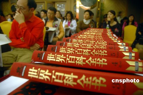 | 2007年4月8日,美國《世界百科全書》全球中文版首發式在海口市舉行。《世界百科全書》國際中文版共20卷,編繹出版歷時11年半,有600多位中國專家學者和高級編校人員參與此項工作,屬海南出版社獨家引進出版。《世界百科全書》1917年問世,1992年出版國際版,全世界有3800多位專家參與撰寫和審訂工作,有17000多個條目涵蓋百科,是全球銷量最大的兼工具書和知識性讀物功能的百科全書。中新社發 善平 攝