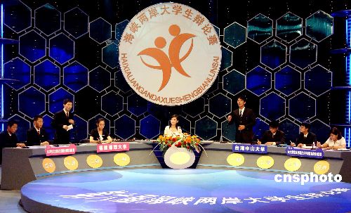 | 7月24日,參加第六屆海峽兩岸大學生辯論賽預賽的福建師范大學代表隊與臺灣中山大學代表隊就“女大學生當全職太太是社會資源的浪費”(正方),“女大學生當全職太太不是社會資源的浪費”(反方)的辯題展開激烈的辯論。當日,為期三天的由福建省科協、福建省教育交流協會和京、滬、渝、蘇、贛、川六省市科協與臺灣中華青年交流協會等聯合主辦的“第六屆海峽兩岸大學生辯論賽”在福州拉開帷幕。來自海峽兩岸高校的十六支代表隊參加本屆海峽兩岸大學生辯論賽,臺灣選派八支代表隊組成五十多人的代表團參賽,人數為歷屆之最。中新社發 劉可耕 攝