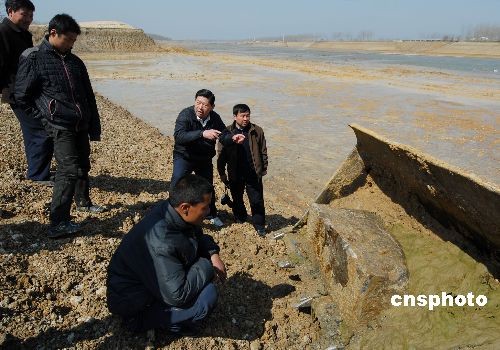 2009年3月25日,在京杭運(yùn)河山東臺(tái)兒莊段拍攝到的浮出水面的明朝古運(yùn)河船閘閘址。近日,一座在水下沉睡了400多年的古水工建筑遺址(古船閘)在京杭運(yùn)河臺(tái)兒莊段進(jìn)行河道疏浚工程時(shí)被發(fā)現(xiàn),這座古船閘位于新閘村北古運(yùn)河中心,船閘東西長約56米,南北約12米,古船閘的木樁繁多,條狀塊石可見,閘門樁基遺址清晰,據(jù)考證船閘修建于明朝萬歷年間,是明代泇運(yùn)河上的丁廟船閘,是棗莊段運(yùn)河(泇運(yùn)河)的八閘之一,距今400多年。此次古船閘的發(fā)現(xiàn),是繼頓莊船閘后的又一重大發(fā)現(xiàn),對(duì)古運(yùn)河棗莊段歷史和古水工建筑的研究具有非常重要的價(jià)值。中新社發(fā) 高啟民 攝