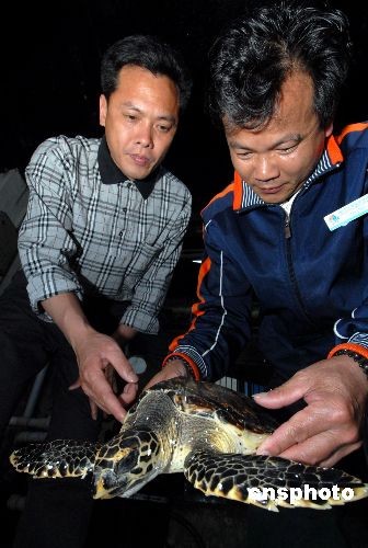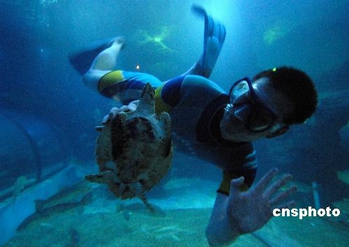 4月13日,福州一漁民將其幾天前在海邊偶然發現的“玳瑁”海龜送進福州左海海底世界。這只“玳瑁”長約12厘米,重約1750克,嘴如鷹嘴,甲殼為褐色,頜緣鋸齒狀。據飼養員介紹,這只小海龜大約才2歲,還屬于“嬰兒”狀態。“玳瑁”又稱十三鱗,屬于國家二級保護動物,一般壽命可達1500歲,成年的玳瑁(約20多歲)身長1米,體重40~60公斤,主要生長于熱帶及亞熱帶地區的暖水性海洋。該類海龜在中國主要分布于臺灣、福建和海南等沿海一帶海域。 中新社發 穆長梓 攝