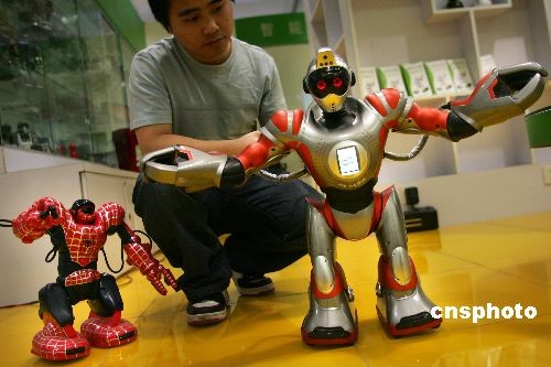 4月15日,北京首家機器人零售商店開業吸引顧客。該店位于中關村一電子商場內。據該店羅經理介紹,他們銷售的機器人有近百種,分為保潔型、娛樂型、教學型、家用型,價格從380元至58000元人民幣不等。保潔型機器人可每天定時清掃地面,自動躲避障礙物。娛樂型包括有機器人寵物、會跳舞的機器人等。教學型機器人一般用于高校計算機編程方面的教學。家用型機器人相對高端,臉龐分析系統可將陌生人的面容發送到主人手機上,具有“看家”功能,還能通過無線終端設備監測家里老人的血壓脈搏等,發現問題會通知主人。中新社發 富田 攝