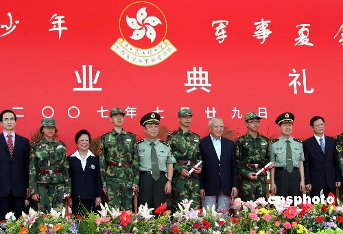 全國政協(xié)副主席董建華(右4)、軍事夏令營名譽主席董趙洪娉(左3)、駐港部隊司令員王繼堂(左5)、政委劉良凱(右2)、中聯(lián)辦副主任鄭坤生(右1)、外交部駐港特派員公署副特派員楊子剛(左1)等香港各界眾多嘉賓出席。