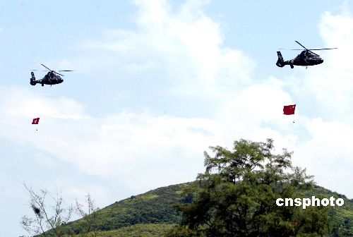 駐港部隊空軍四架軍機攜帶中華人民共和國國旗和香港區(qū)旗低空掠過典禮上空﹐以此向夏令營的學(xué)員順利結(jié)業(yè)表示祝賀。