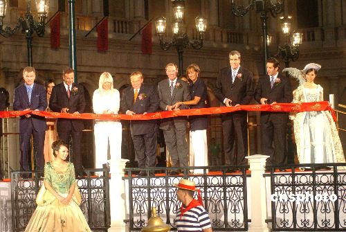 拉斯維加斯金沙集團(tuán)主席兼執(zhí)行總裁蕭登·艾德森(左四)與集團(tuán)總裁威康·懷德(左五)在澳門(mén)威尼斯人度假村酒店圣馬可廣場(chǎng)為大運(yùn)河購(gòu)物中心開(kāi)業(yè)剪彩。