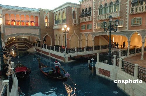 貢多拉小船在澳門(mén)威尼斯人度假村酒店仿造意大利水鄉(xiāng)威尼斯的人造運(yùn)河上蕩舟。