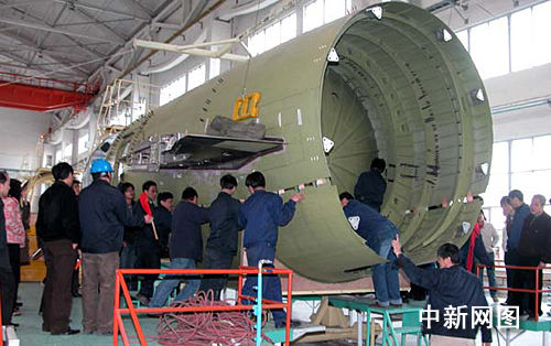 中國首架自主知識產權的噴氣支線客機ARJ21總裝前中后機身上下對合。