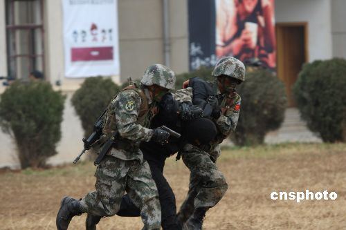 圖為訓練中,“恐怖分子”被特戰隊員捕獲。