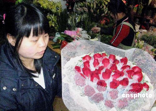 2月13日,福州市花店女店員在包裝打理供應情人節市場的紅玫瑰。情人節前夕,福州市一朵玫瑰售價高漲到15元人民幣,與平日相比身價倍增。中新社發 劉可耕 攝