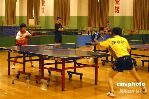 五月二十七日,四川省乒乓球運動員在河南鄭州進行緊張的訓練。連日來,為避免地震的影響,四川省包括游泳、射擊、乒乓球、網球、跆拳道等六支運動隊九十多名運動員轉移到河南鄭州進行訓練,以全力備戰北京奧運會和明年舉行的全運會。 中新社發 史寶銀 攝