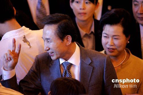 圖為韓國總統李明博在北京大學發表演講后,向為其拍照的學生們擺POSS。中新社發 張宇 攝