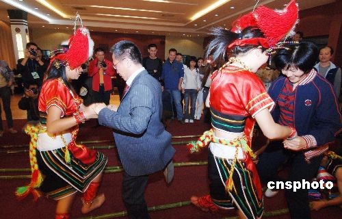十一月十九日晚,由八十多位境內外媒體記者等組成的“世界看漳州——福建土樓大型采風活動”采風團成員與居住在華安縣的高山族姑娘共跳高山族竹桿舞。 中新社發 劉可耕 攝