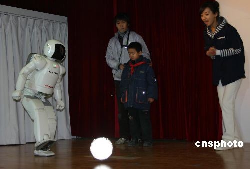 12月9日,目前世界上最先進(jìn)的類人型機(jī)器人ASIMO在四川都江堰進(jìn)行系列節(jié)目表演,拉開“ASIMO中國行”系列活動的序幕。圖為ASIMO表演足球射門。中新社發(fā) 黃永莉 攝